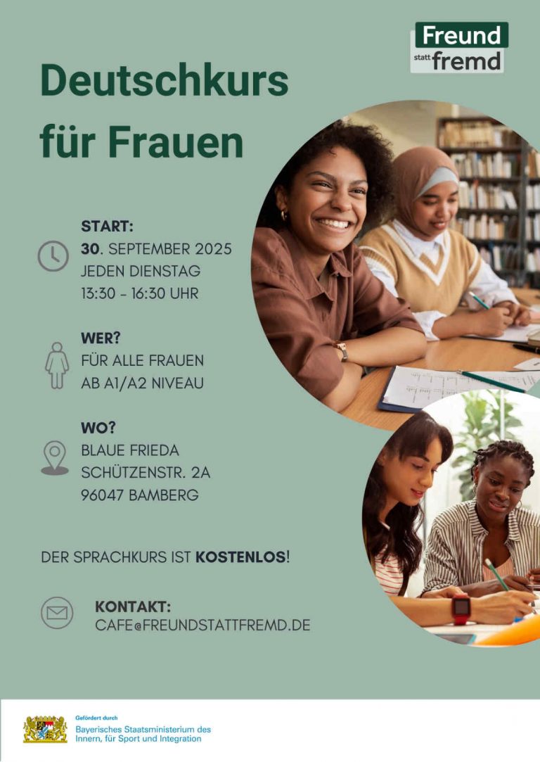 Neuer Deutschkurs für Frauen! Am 30.09.2025 startet unser neuer Deutschkurs für Frauen ab A1/A2-Niveau. Der Kurs findet immer dienstags von 13:30 bis 16:30 Uhr in der Blauen Frieda (Schützenstraße 2a, Bamberg)