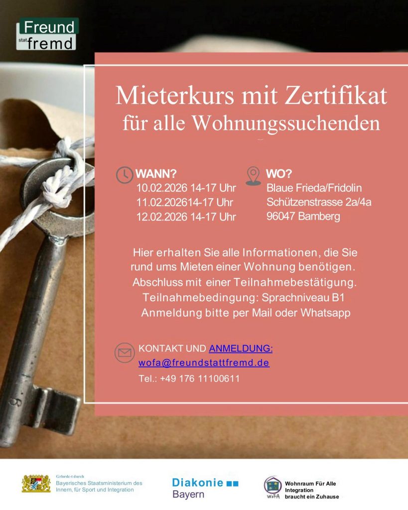Mieterkurs mit Zertifikat für alle Wohnungssuchenden   WANN? 10.02.2026    14 – 17 Uhr 11.02.2026    14 – 17 Uhr 12.02.2026    14 – 17 Uhr   WO? Blaue Frieda/Fridolin, […]